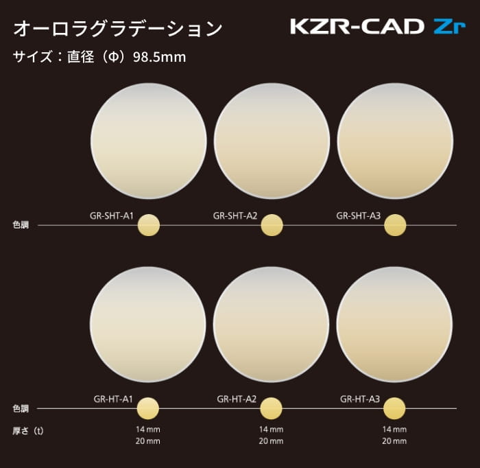 用途や症例によってオーロラグラデーションエステティックジルコニア、テクニカルジルコニアを選択できます。