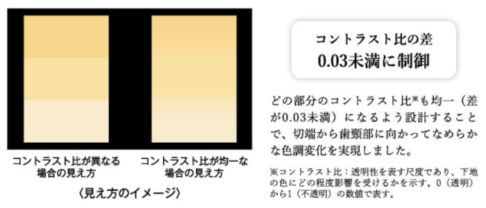 どこを取っても透明性(コントラスト比)が均一になるように設計しているため、層の境界部分が判別できにくい自然な色の勾配を示します。